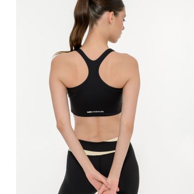 Γυναικείο αθλητικό μπουστάκι με τύπωμα στο πίσω μέρος και στρογγυλή λαιμόκοψη. Λεπτομέρεια με λευκή ρίγα. Στενή εφαρμογή.