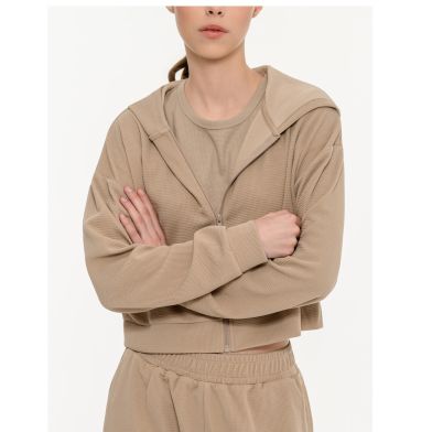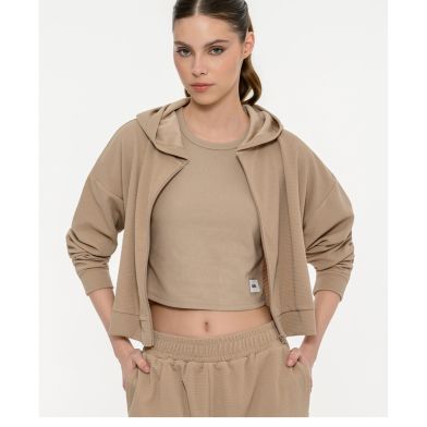 Γυναικεία ζακέτα με waffle ύφασμα και κουκούλα. Κλείσιμο με φερμουάρ μπροστά. Κανονική εφαρμογή.